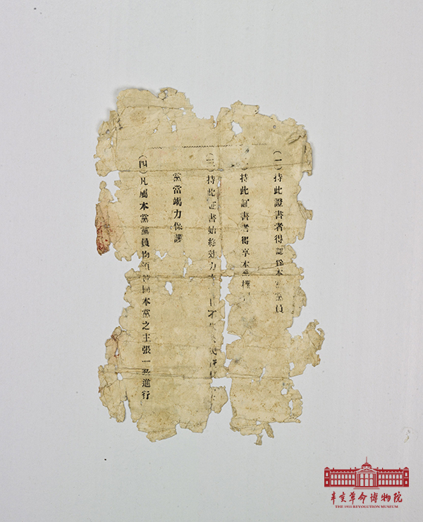 徐元音的共和黨證書,雙面印刷,殘損嚴(yán)重。正面上端居中印有“共和黨”三字,橫線下自右而左印有“理事長(zhǎng)黎元洪”、理事伍廷芳、張謇、那彥圖”、“湖北支部長(zhǎng)孫武”“給”“谷城分部黨員徐元音證書”?!敖榻B人徐玉囗、王囗囗”。“中華民國(guó)元年十一月十四日發(fā)?!惫埠忘h湖北支部朱印鈐理事長(zhǎng)至介紹人字跡之間,篆字。背面橫線下自右而左豎行印有“(一)持此證書者得認(rèn)為本黨黨員;(二)持此證書者得享本黨權(quán)利;(三)持此證書者始終效力囗囗囗囗囗囗黨當(dāng)極力保護(hù);(四)凡屬本黨黨員均須贊同本黨之主張一致進(jìn)行。徐元音,湖北谷城人,其生平不詳。